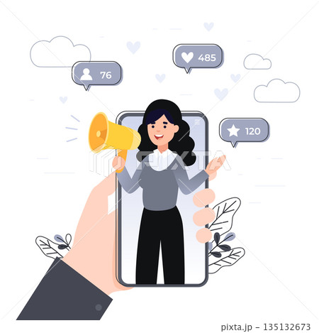Vector illustration for internet advertisement. Hands holding smartphone with a girl shouting in loud speaker. Influencer marketing, social media or network promotion, SMM banner, landing page,flyer.