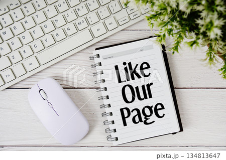 Like Our Page text with keyboard and wireless mouse on wooden background