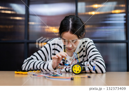 Student girl concentrates on assembling robotic car with wires and components at workshop. Engineering classroom with technology and enhancing creativity and learning. STEM education concept.