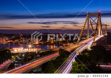 從福岡縣北九州市Mekari Park天文台看到的黃昏關門橋