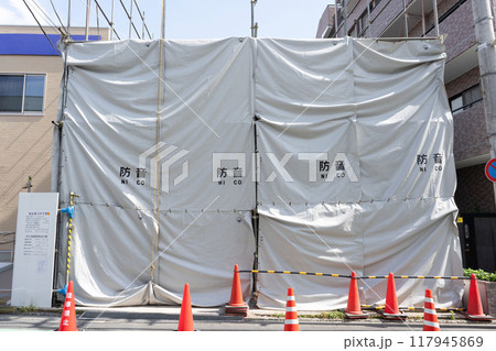 大規模拆除工作:高空作業工人在臨時鷹架上安裝隔音板