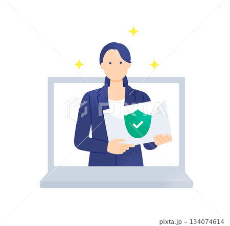 防止訊息洩漏 綠色盾牌和勾號 女性發送安全電子郵件 插圖