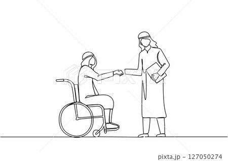 Single continuous line drawing disabled Arabian businessman in wheelchair shaking hand with business partner. Disability manager dialogue with business colleague. One line draw graphic design vector