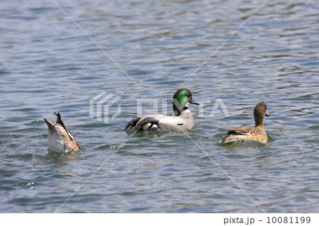一隻綠頭鴨(雄性)和一隻普通骨頂鴨在淀川河岸邊覓食