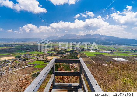 在晴朗的春天,從城山展望台可以看到阿蘇山(阿蘇五山)和阿蘇鄉村全景「阿蘇城」的壯麗景色