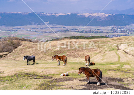 在熊本縣阿蘇市草千里濱海灘吃草的馬