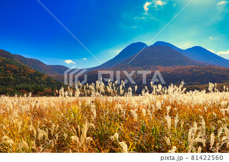 秋天的蓼原濕地和九重山脈(大分縣九重町)