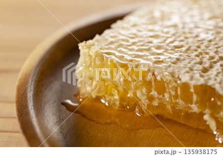 特寫鏡頭:新鮮的有機蜂巢放在木盤上,旁邊放著一匙金黃色的蜂蜜