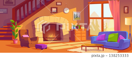 Living room with fireplace background banner in cartoon design. Cosy home interior with sofa and armchair, cushions, coffee table, warm fire, wooden ladder and big window. Vector cartoon illustration