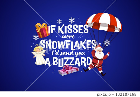Christmas quote if kisses were snowflakes i would send you a blizzard. Vector holiday greeting card with Santa Claus, angel toy, gift boxes and snowflakes. Funny cartoon Santa flying on parachute