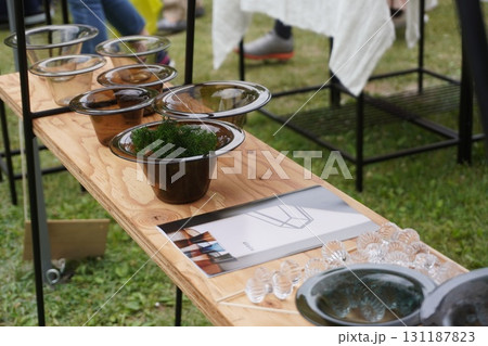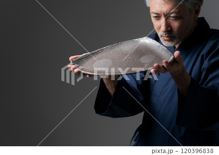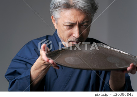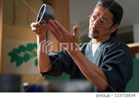 一個穿著日式服裝的男人看著陶瓷、陶藝家、鑑定師的形象