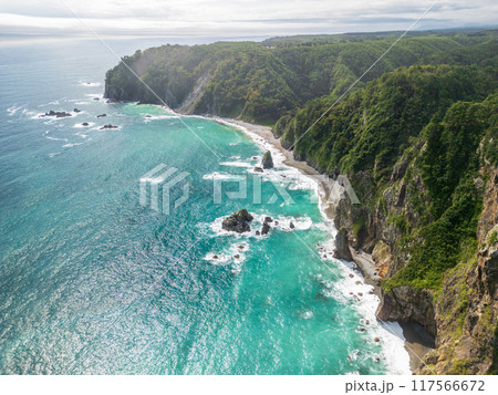 航空攝影「岩手郡」:用無人機從海邊拍攝高聳的宇之須懸崖田野畑村全景