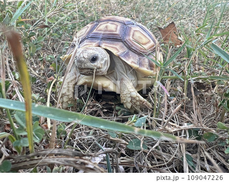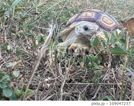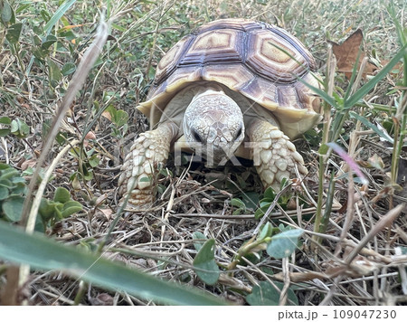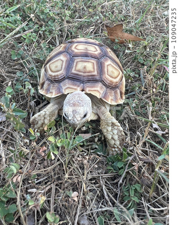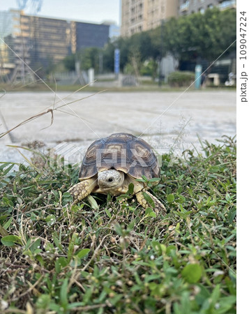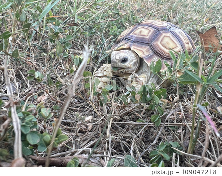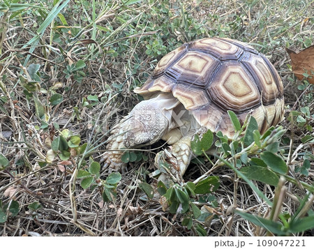 年幼的寵物蘇卡達陸龜在公園吃草與散步