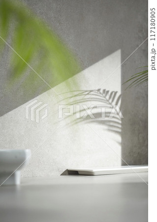 A gray-toned tile background with various props with sunlight coming through the window.