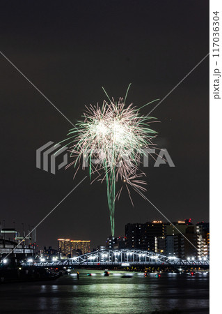 從中央大橋(隅田川煙花匯演)看到的天空樹和煙花