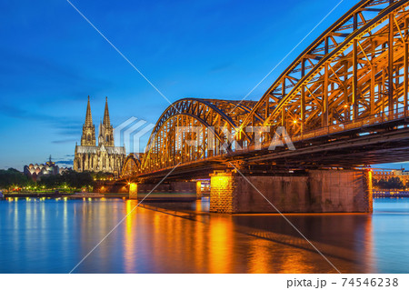 Cologne (Koln) Germany, sunset panorama city skyline at Cologne Cathedral (Cologne Dom) with Rhine River and Hohenzollern Bridge