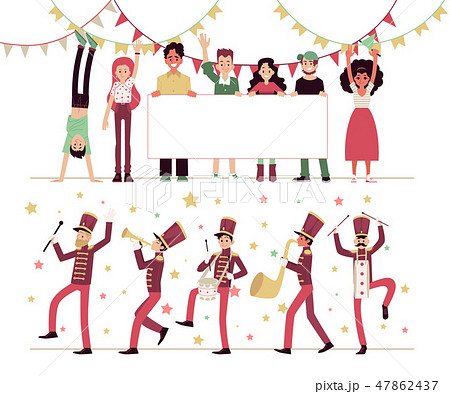 Parade, people with musical instruments, marching band. Demonstration with a blank poster.