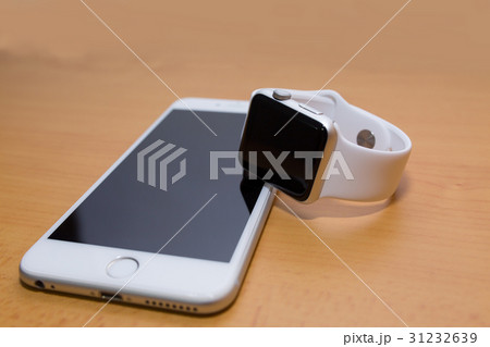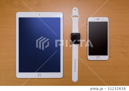 柚木桌上的智慧型手機及平板裝置及智慧型手錶