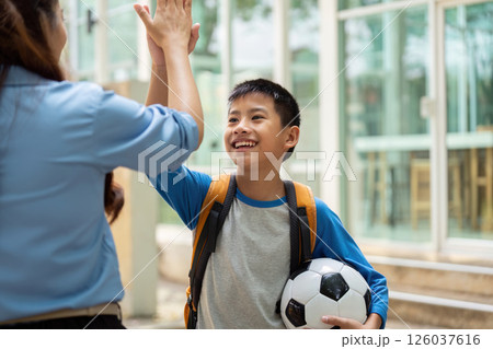 Back to School and Soccer Excitement. A cheerful student interacts with an adult while holding a soccer ball.