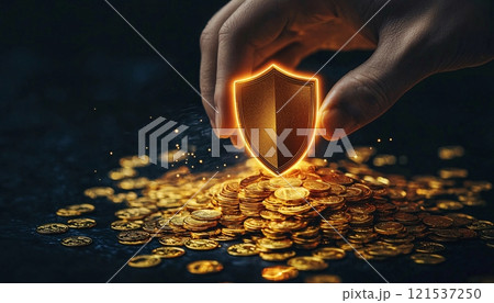 digital safe filled with golden crypto coins, surrounded by cybersecurity icons and shield graphics, creates high tech atmosphere under soft blue and white lighting