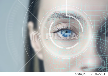 Close-up view of a young woman's eye with digital overlay showcasing biometric scanning technology