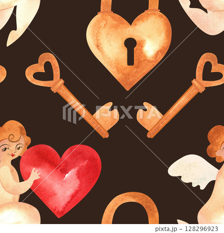 Seamless pattern with cupids, heart-shaped locks and keys. Watercolor illustration. Wrapping paper for wedding and Valentine's Day. Vintage style.