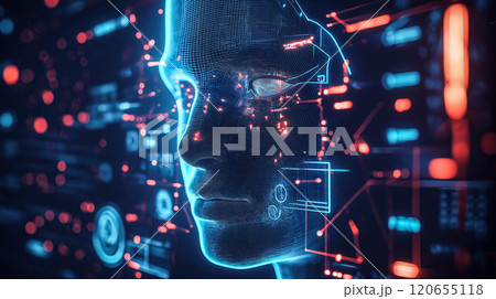 Biometric face holographic glows with intricate patterns. The concept of identity verification, advanced technology, and security systems. Generative AI.