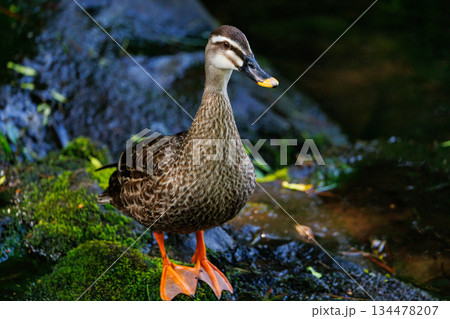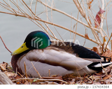 一隻綠頭鴨在岸邊休息