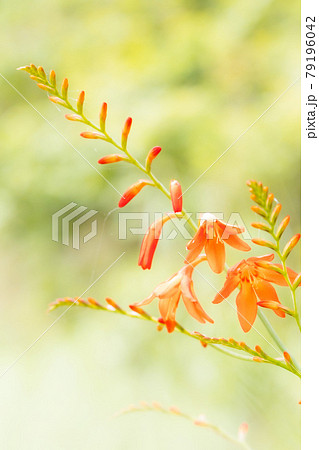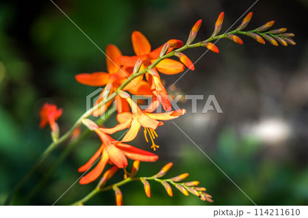 Crocomia 特寫,夏季盛開明亮的橙色花朵