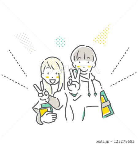 微笑的大學生做出 V 形手勢 — — 簡單而時尚的線條畫插圖