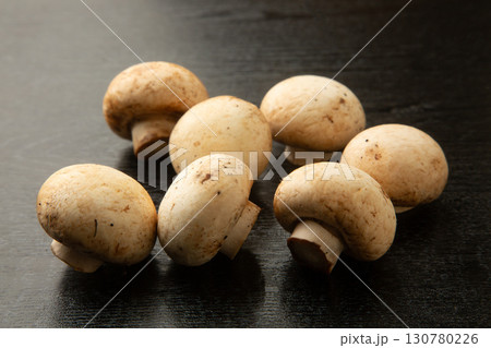 White Button mushroom or Champignon mushroom (Agaricus bisporus) on wooden plate, Food ingredient