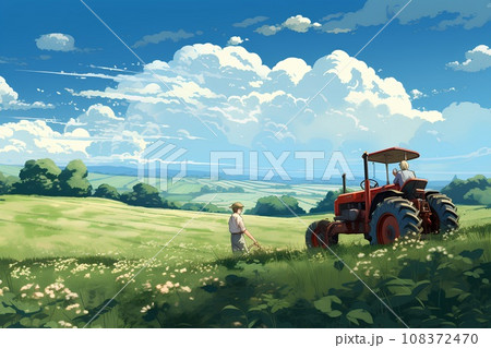 綠豆大田與秋藍天晴的風景(插畫風格)