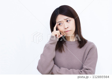 一位 30 多歲的家庭主婦在白色背景前低著頭,憂心忡忡