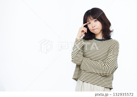 一位 30 多歲的家庭主婦在白色背景前嚴重擔心
