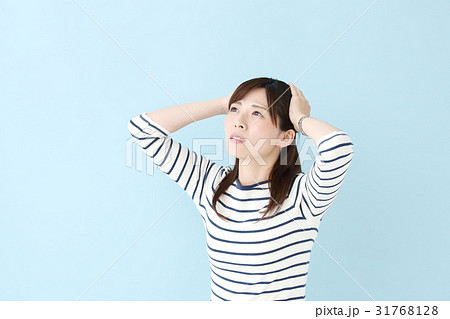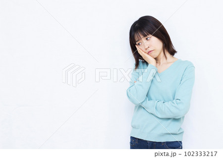一個三十多歲的女人,在白色背景前擔心抱頭