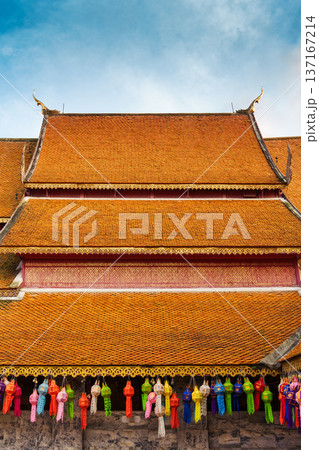 Beautiful traditional oriental lantern decoration in Wat Phra That Doi Suthep, Chiang Mai, Thailand. Colorful paper lantern in buddhist temple, Chiangmai. Topic of vacation, travel, trip, cruise, tour
