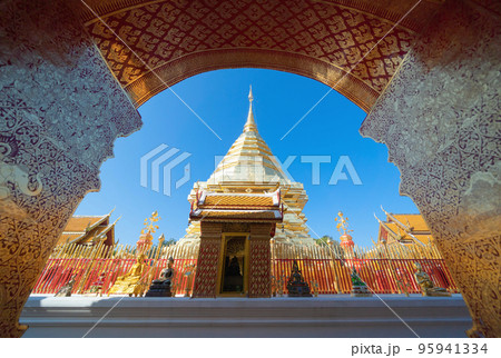 Phra That Doi Suthep, a buddhist temple. Thai architecture temple golden holy shrines light religious, Northern Chiang Mai, Thailand.