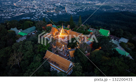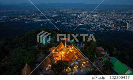 Aerial view of Wat Phra That Doi Suthep temple at twilight in Chiang Mai, Thailand, Wat Phra That Doi Suthep Buddhist temple in Chiang Mai, Famous Thailand Temple in Chaing Mai City background.
