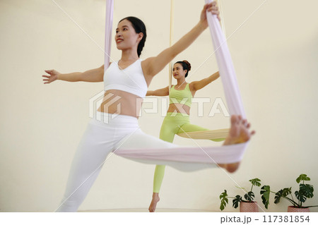 Practicing Aerial Yoga on Suspended Silk Hammocks