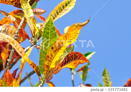 Tropical ornamental foliage of croton Codiaeum variegatum with broad variegated leaves and vivid veins used for decorative plant design
