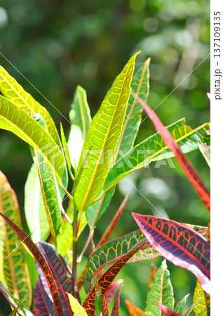 Close up of colorful croton leaves Codiaeum variegatum with green red and yellow tones showing rich tropical foliage texture in natural light