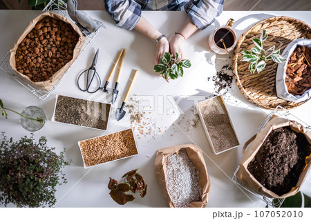 Woman transplant variegated monstera at home garden use drainage granule soil ground on table