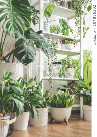 Houseplant domestic jungle garden organization fresh natural plant pots variegated monstera at room