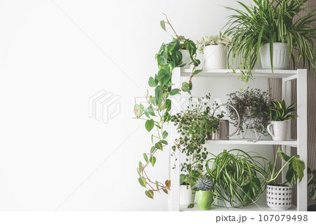 Houseplant domestic jungle garden organization fresh natural plant pots. Copy space.