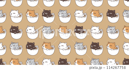 cat seamless pattern coffee cup kitten calico neko vector hot tea pet cartoon doodle tile background gift wrapping paper repeat wallpaper scarf isolated illustration brown design