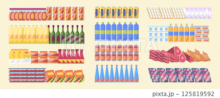 Cartoon Color Different Types Supermarket Food and Drink in Rows Set for Refrigerator and Shelving . Vector illustration