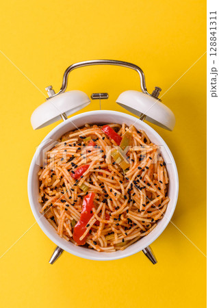 Italian pasta with meat, sauce and vegetables. Conceptual background time to eat pasta