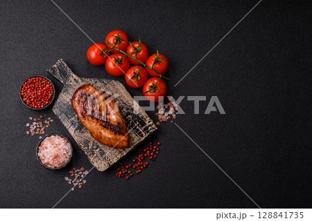 Juicy chicken fillet baked on the grill with salt, spices and herbs