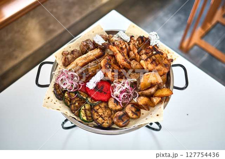 Delicious grilled barbecue meat skewer kebab with vegetables.