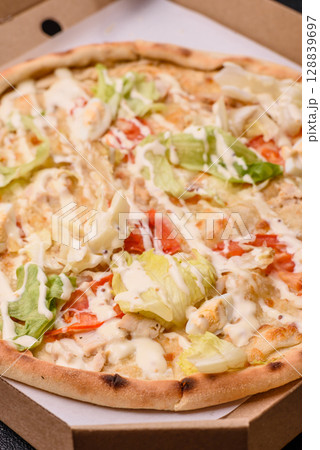 Italian caesar pizza with cheese and chicken, lettuce leaves and sauce